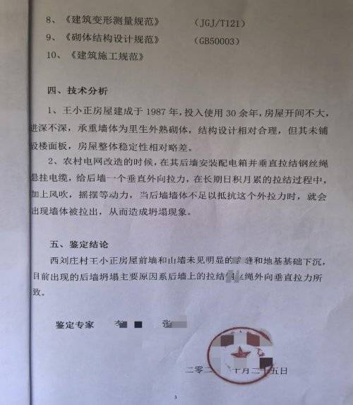 为了厘清房屋坍塌的真正原因,也为了给自己的遭遇寻求合理说法,相关方委托了第三方专业机构进行检测。2025 年 12 月 25 日,这份承载着房主期盼的鉴定报告终于出炉,报告给出了明确结论:房屋前墙和山墙无明显裂缝及地基下沉现象,虽整体稳定性因年限较长偏弱,但后墙坍塌的主要原因,是电力公司架设的电缆长期受风吹、摇摆影响,产生持续向外的拉力,超出了后墙体的承载能力,最终导致墙体被拉出坍塌。这份鉴定结果,让房主多年的顾虑得到印证,也为事件的合理解决提供了关键依据。